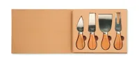 4 darab gumifa markolatú, rozsdamentes acél sajtkésből álló készlet. Hullámkarton díszdobozban. A fa...