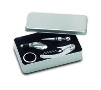 4 részes boros készlet bádogdobozban. Dugóhúzót, palack visszazárót, kiöntőt és cseppfogó gyűrűt tar...