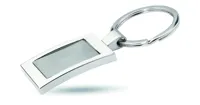 Téglalap alakú fém kulcstartó színes poliészter szövött pánttal.