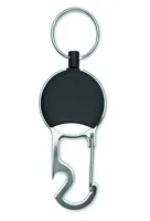 Visszahúzható bérlet- vagy belépőkártya tartó ABS-ből, csíptetővel, kulcstartóval és üvegnyitóval.