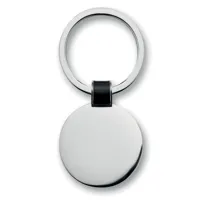 Kerek fém kulcstartó újrahasznosított PU-bőr betéttel.