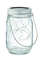 Napelemes befőttesüveg kültéri lámpa 20 LED-es fényfüzérrel. Akasztóval a tetején. Üzemidő kb. 5 óra...