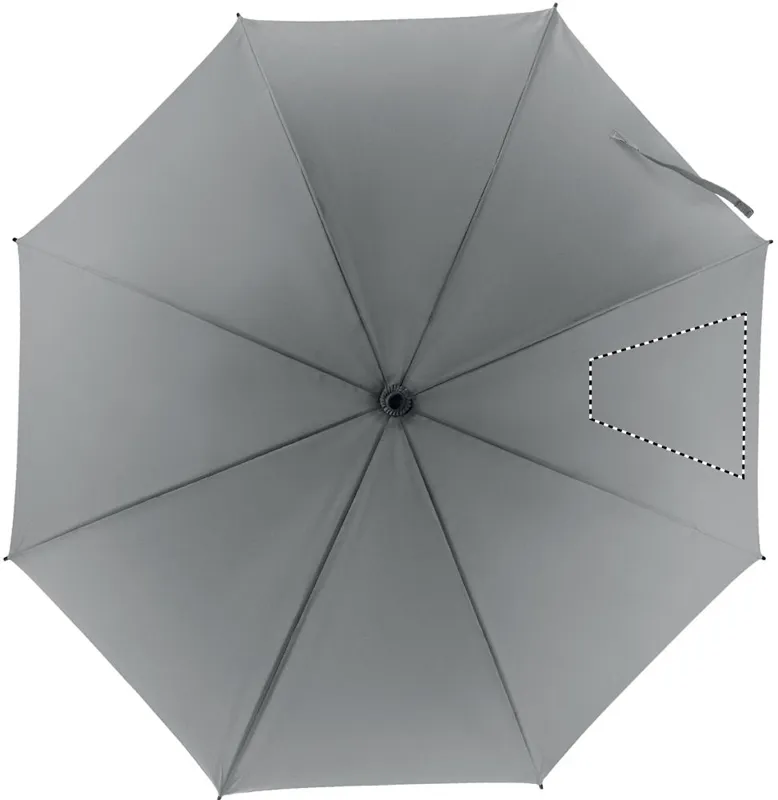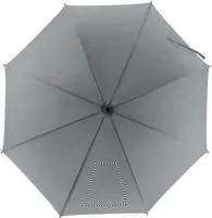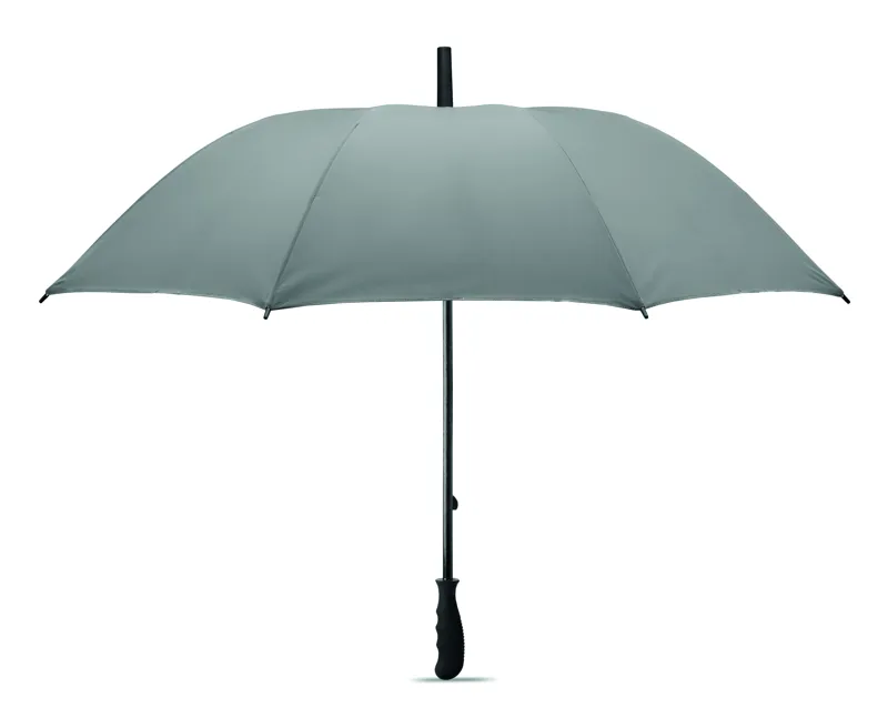 23 colos kézi nyitású szélálló esernyő magas fényvisszaverő képességű poliészterből, üvegszálas vázzal és bordákkal. Fekete műanyag csúcsok. Fekete gumírozott markolat. Kézi záródás.