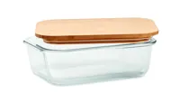 Üveg uzsonnásdoboz bambusz tetővel, a fedelet rögzítő szilikon pánttal. Űrtartalom 800ml. A bambusz természetes anyag, termékenként szín- és méretbeli eltérések jelentkezhetnek, ami befolyásolhatja a dekoráció végső eredményét.