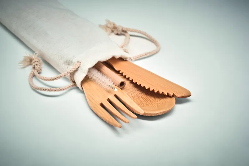 Többször használható bambusz evőeszköz készlet vászon tokban. Bambusz kést, villát, kanalat és szívószálat, valamint rozsdamentes acél tisztítókefét tartalmaz. A bambusz természetes anyag, színében, mintázatában és méretében esetenként eltérő lehet.