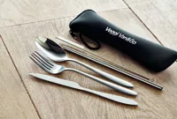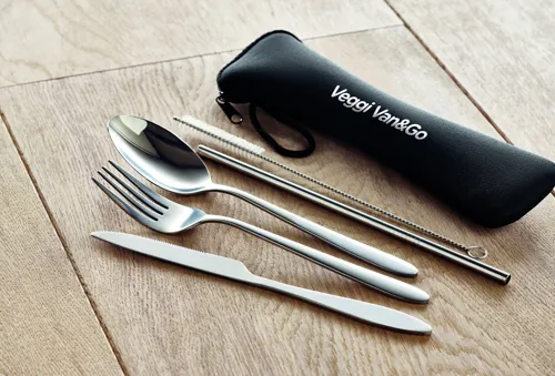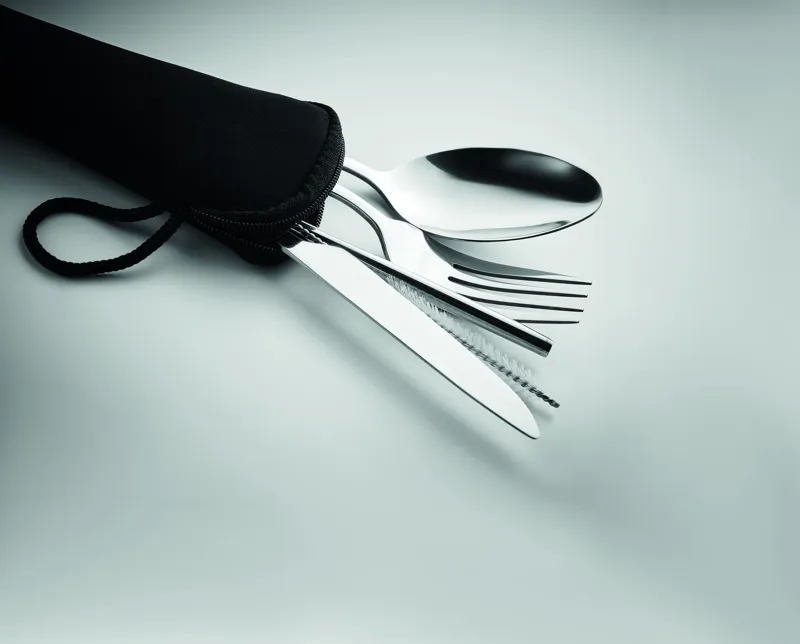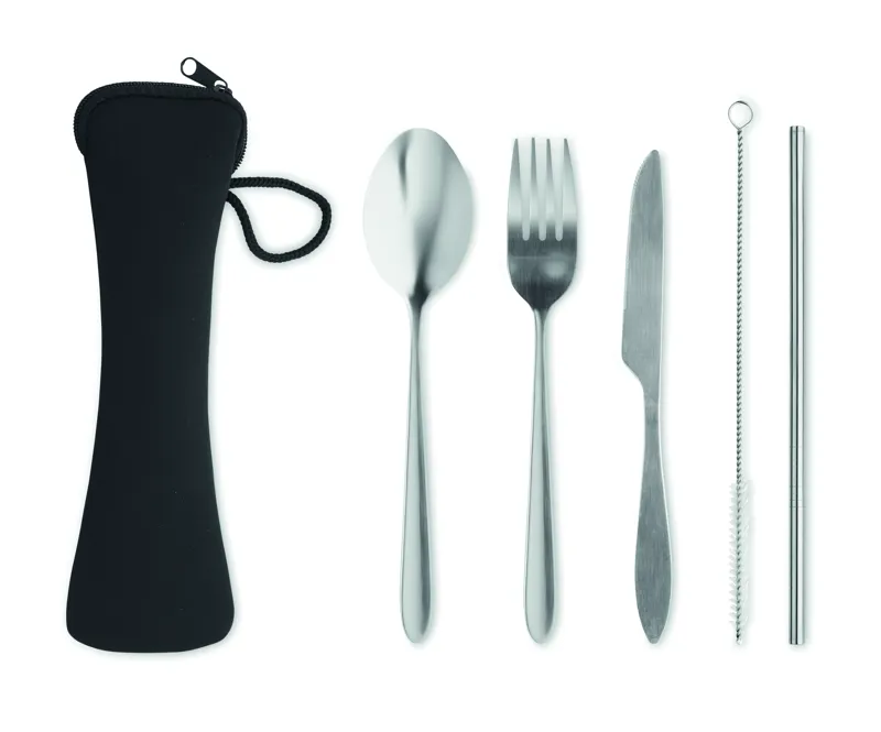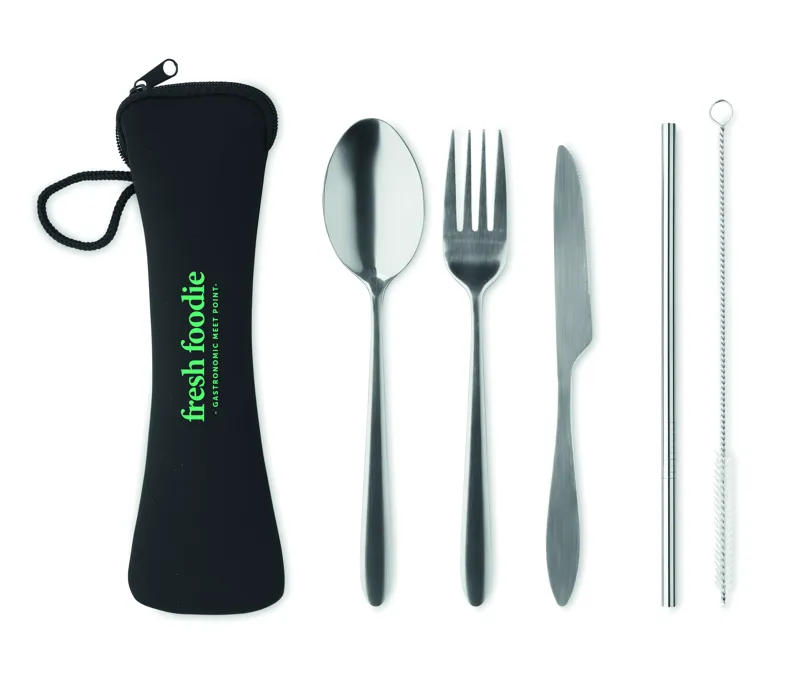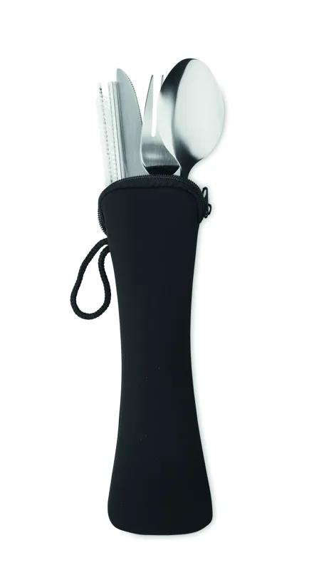 Rozsdamentes acél evőeszköz készlet neoprén tokban. Kést, villát, kanalat, szívószálat és tisztítókefét tartalmaz.
