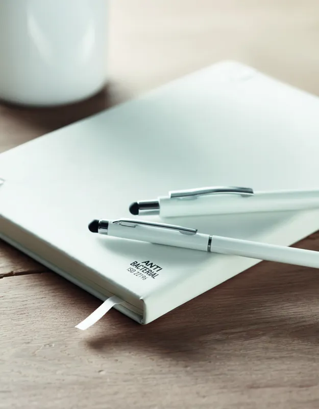 Nyomógombos érintőhegyes golyóstoll ABS műanyag, antibakteriális tolltesttel. ISO 22196. Kéken író betét.