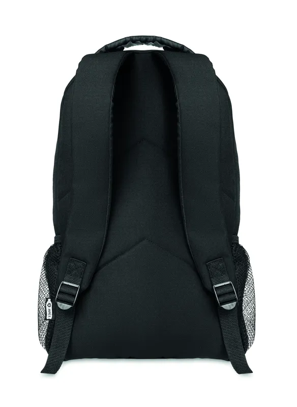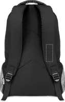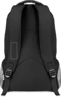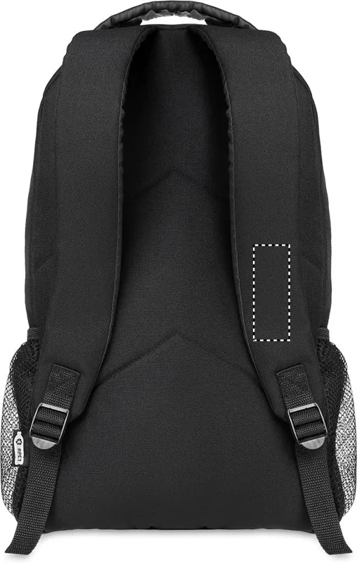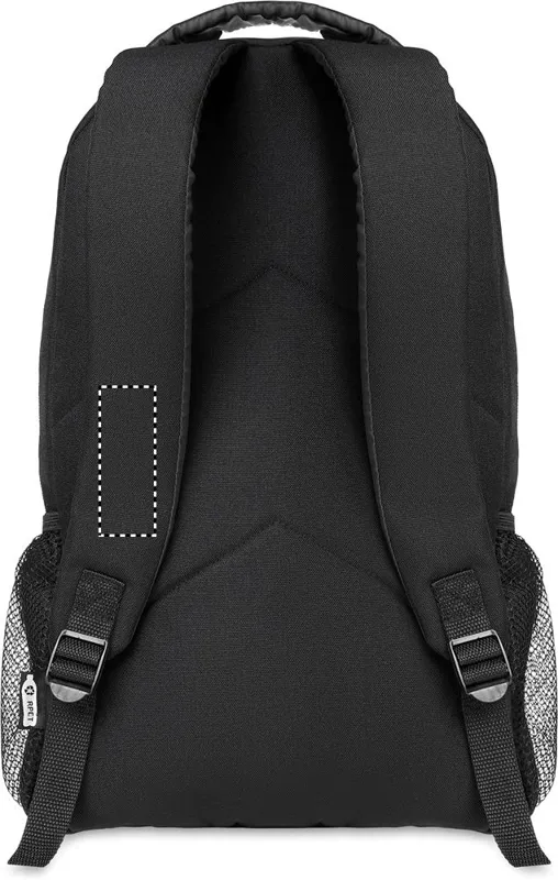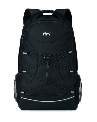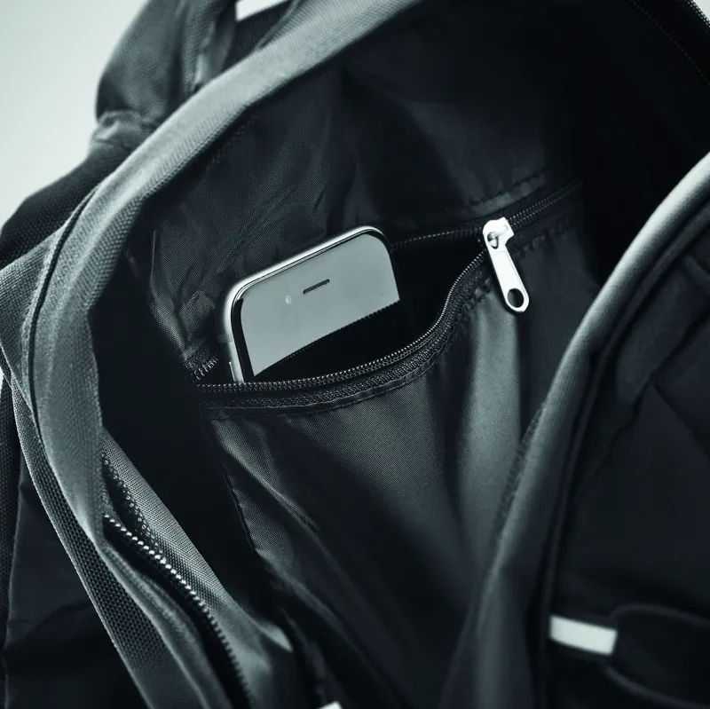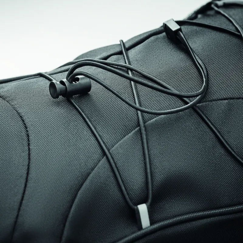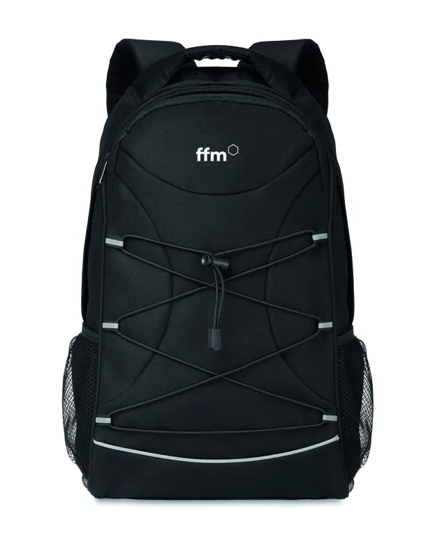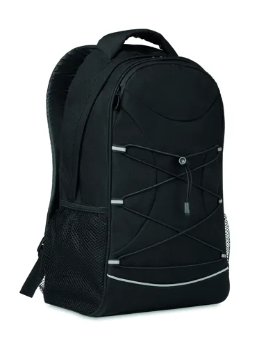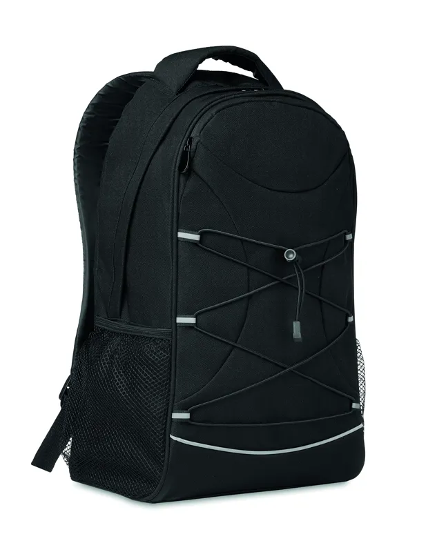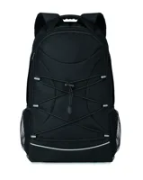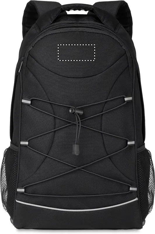 600D RPET anyagból készült hátitáska, az elején fényvisszaverő részletekkel, mindkét oldalán hálós zsebekkel.