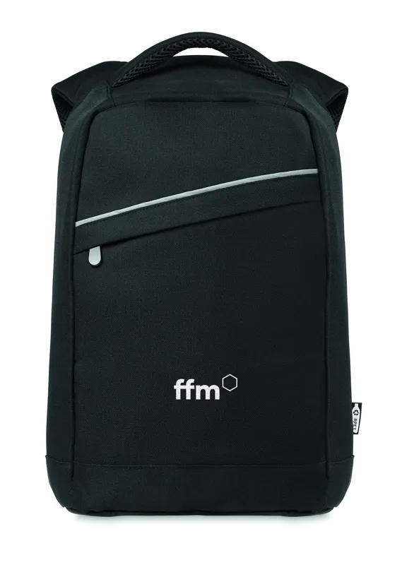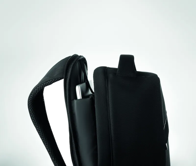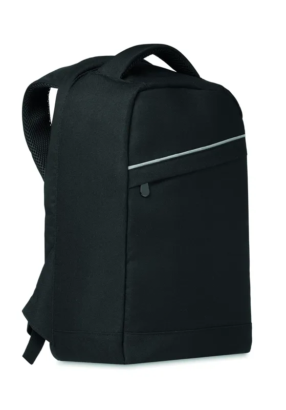 600D RPET hátitáska párnázott vállpántokkal, 13 colos laptop rekesszel a fő belső tárolórészben, elöl cipzáras zsebbel. A nagyobb biztonság érdekében a fő tárolórekesz cipzárja a hátoldalon található.