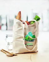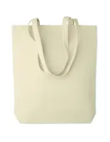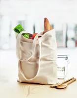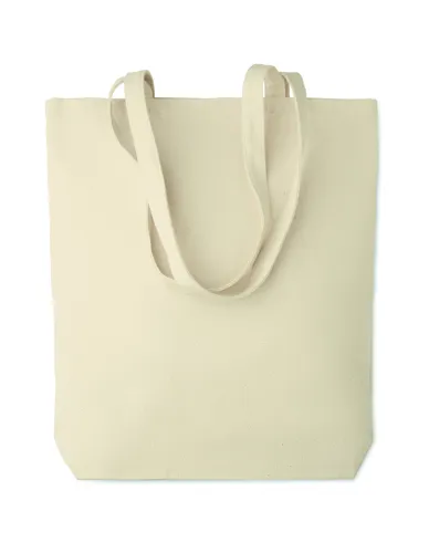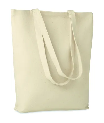 Vászon bevásárlótáska hosszú fülekkel, az alján toldással. Ideális táska a napi bevásárláshoz. A hosszú fülek segítségével akár kézben, akár vállra téve könnyen hordozható. Ez a vászon táska az alján toldással rendelkezik, így több minden fér bele, mint egy hagyományos alakú bevásárlótáskába. 270 g. vastag anyag. A káros anyagok textilipari felhasználására vonatkozó tanúsított szabvány szerint készült.