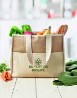 Ez a juta bevásárló táska hosszú fülekkel, tépőzáras záródással, a belső oldalán pedig az élelmiszerek frissességének megőrzése érdekében hőszigetelő fólia réteggel rendelkezik. Az elülső részen széles, tépőzáras vászonzseb található a kisebb tárgyak számára. Ez a juta táska tökéletes a napi bevásárláshoz. Hosszú élettartammal rendelkezik, ami kiváló alternatívát jelent az eldobható, műanyag zacskókkal szemben.