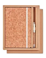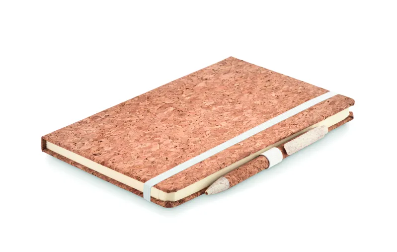 A5 parafa jegyzetfüzet, hozzáillő tollal. Parafa keménytáblás borító. Cérnafűzött. 160 vonalas oldal (80 lap) újrahasznosított papírból. Elasztikus zárópánt és tolltartó hurok. Hozzáillő nyomógombos golyóstoll parafa tolltesttel, 50% búzaszalma és 50% PP anyagból készült szerelvényekkel. Ajándékdobozban. A parafa 100%-ban természetes anyag. Szerkezeti jellege és felületi porozitása miatt az egyes tárgyak végső emblémázási eredménye eltéréseket mutathat.