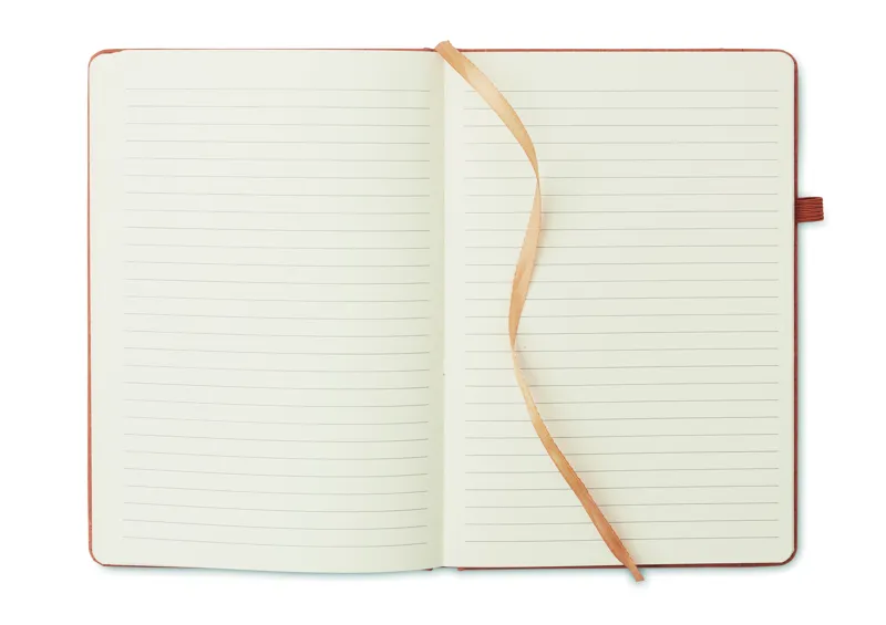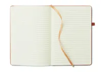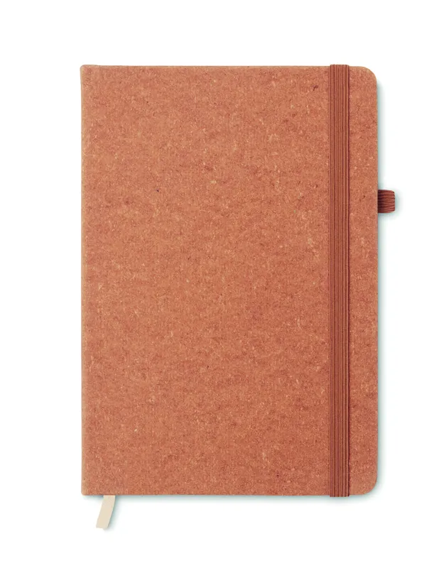 A5 jegyzetfüzet, 70%-ban fogyasztás előtti újrahasznosított bőrből és 30%-ban latexből készült PU borítóval. Cérnafűzött. 160 vonalas oldal újrahasznosított papírból (80 lap). Színben illeszkedő elasztikus zárópánt, tolltartó hurok és könyvjelző szalag.