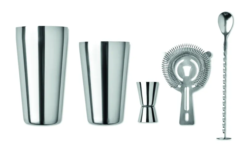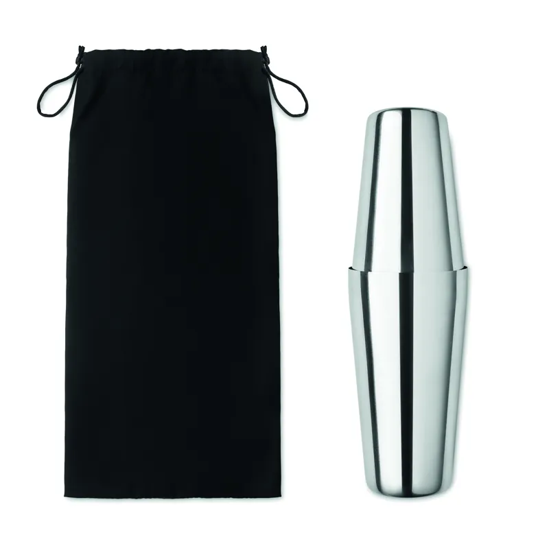 Rozsdamentes acél koktélkészlet 750 ml shakerrel, mérőedénnyel (30 ml) és szűrővel, pamut tasakban.