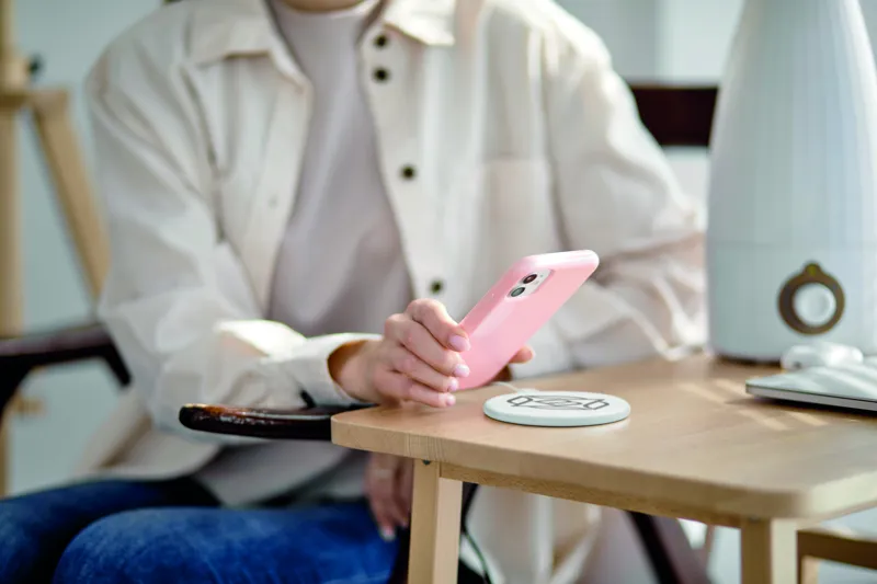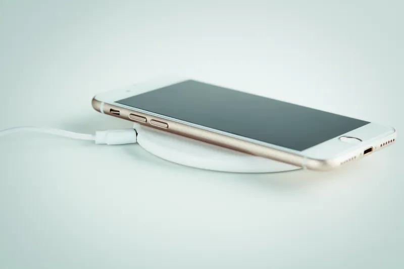 Újrahasznosított ABS vezeték nélküli töltő. Csatlakoztassa a számítógépéhez, majd helyezze az okostelefont a készülékre. Gyorstöltést lehetővé tévő DC 9V/1.1A (10W) teljesítménnyel.