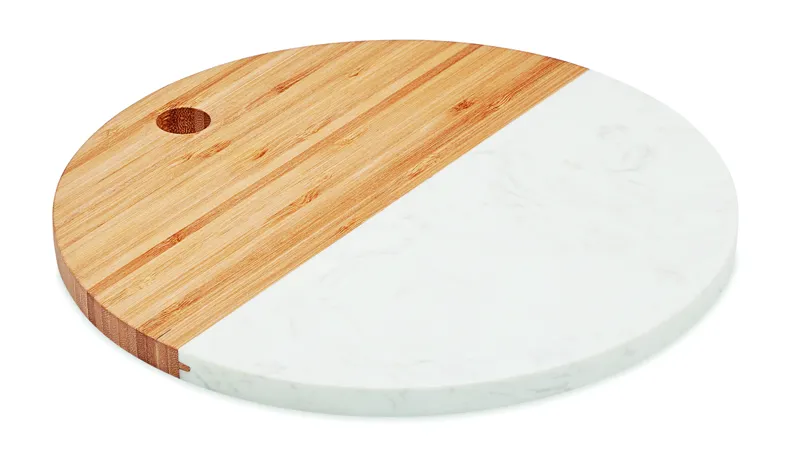 Tálalódeszka márványból és bambuszból. Kör alakú. A bambusz természetes anyag, színében, mintázatában és méretében esetenként eltérő lehet.