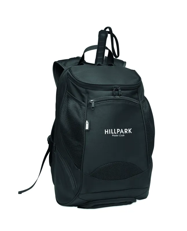 600D RPET többfunkciós sport hátitáska több rekesszel, többek között padel ütő tárolására alkalmas párnázott résszel, valamint állítható vállpánttal.