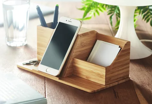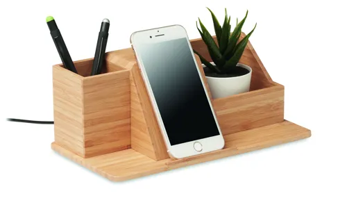 Bambusz asztali rendszerező és tolltartó 10W-os vezeték nélkül töltő telefonállvánnyal. Teljesítmény: DC 9V/1.1A (15W) a gyors töltéshez. A bambusz természetes anyag, színében, mintázatában és méretében esetenként eltérő lehet. FSC®-certified | FSC 100 %, P5.7, FSC-C213206 FSC 100% | N5.7 | FSC-C213206