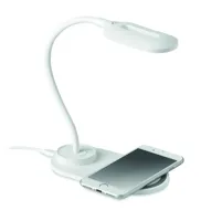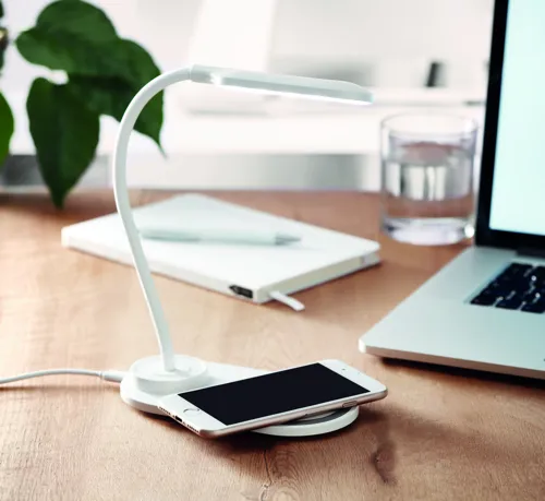ABS műanyagból készült asztali lámpa 10 LED fénnyel és 10W-os vezeték nélküli töltővel. Érintőszenzoros. Teljesítmény: DC 9V/1.1A (10W) a gyorstöltéshez.
