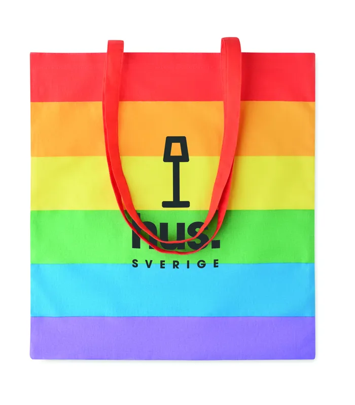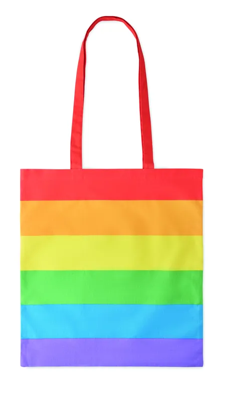 200 g vastag szivárványszínű pamut bevásárlótáska hosszú füllel. Adjon egy kis színt márkájának vagy különleges üzenetének ezzel a vidám bevásárlótáskával. Ez a táska ideális a napi bevásárláshoz. A hosszú füleknél fogva hordozhatja, vagy a vállára akaszthatja, hogy a keze szabadon maradjon. Teherbírás 2,5 kg.