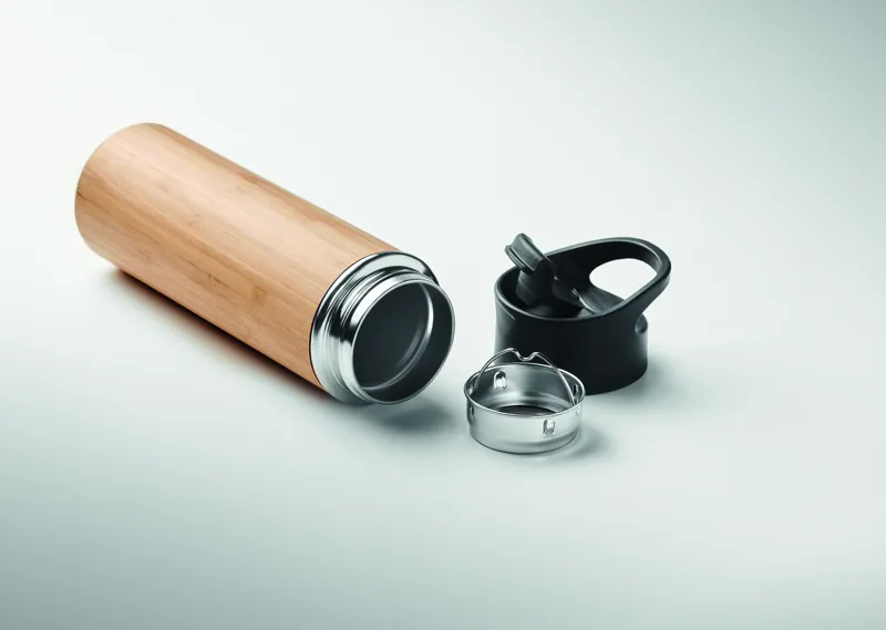 Duplafalú, rozsdamentes acélból készült termosz bambusz külső borítással és PP-ből készült, fogantyús fedéllel. Űrtartalom: 450 ml. Tartsa hidegen vagy melegen italait ebben a hőszigetelt palackban. Akár a kávét, akár a teát vagy más meleg italokat kedveli, ebben a termoszpalackban könnyen magával viheti a fogantyús fedélnek köszönhetően. A bambuszborítás természetes megjelenést kölcsönöz a palacknak és kiemeli a többi palack közül. Szivárgásmentes. A bambusz természetes anyag, termékenként szín- és méretbeli eltérések jelentkezhetnek, ami befolyásolhatja a dekoráció végső eredményét. FSC®-certified | FSC 100%, N5.7, FSC-C213206