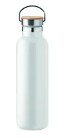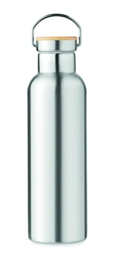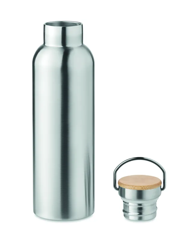 Duplafalú rozsdamentes acél termosz fém fogantyús bambusz kupakkal. Űrtartalom: 750 ml. Szivárgásmentes. A bambusz természetes anyag, színében, mintázatában és méretében esetenként eltérő lehet.
