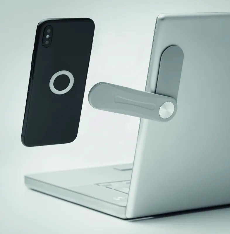 ABS műanyagból készült mágneses telefontartó, a hátoldalán 3M ragasztóval ellátott fémgyűrűvel. Laptopra rögzíthető.