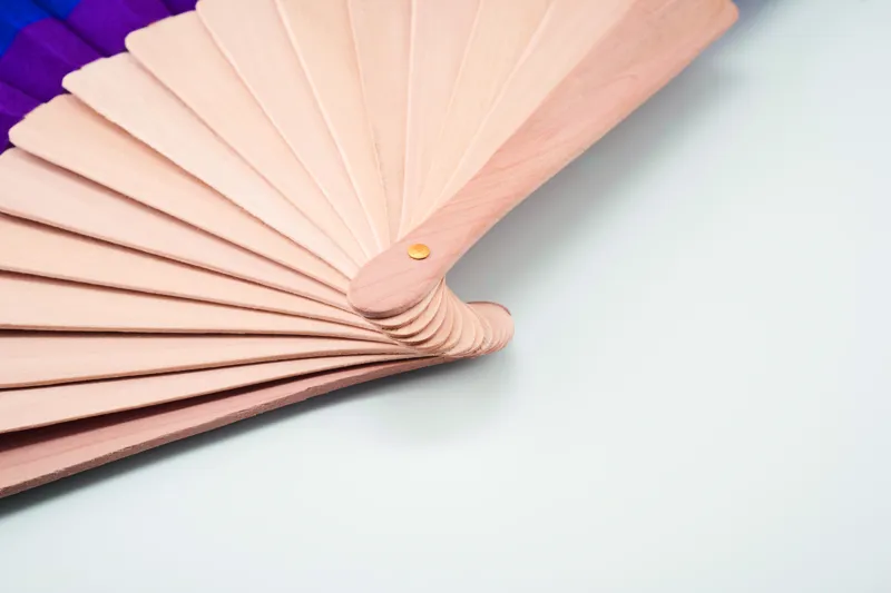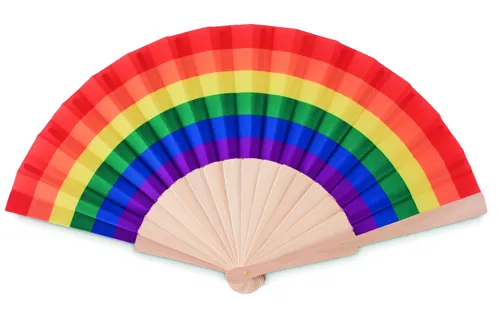 Kézi legyező fa bordákkal, poliészter szövettel, szivárványszínben.