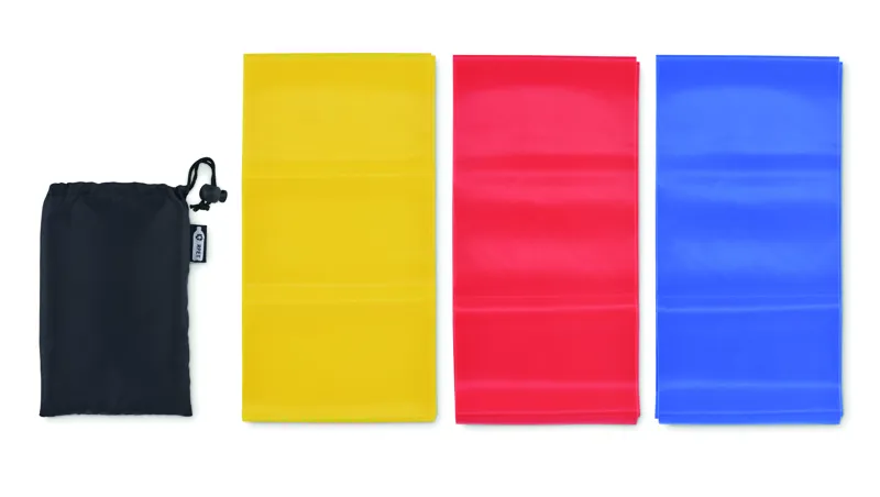 3 db TPE fitneszszalagból álló készlet RPET poliészter tasakban. A fitneszszalagok mindegyike különböző erősségű az optimális edzés érdekében.