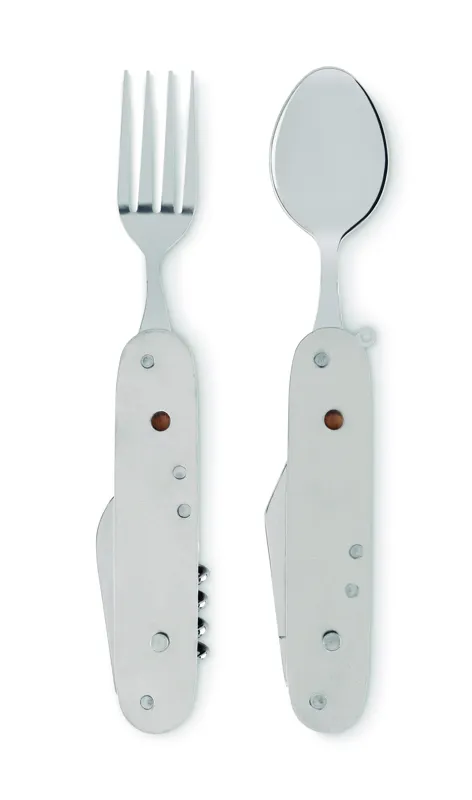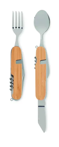 Fém multifunkciós összecsukható kemping evőeszköz készlet fa nyéllel, 5 funkcióval. Tartalmaz villát, kanalat, konzervnyitót, dugóhúzót és kést. 2 részre szétválasztható.