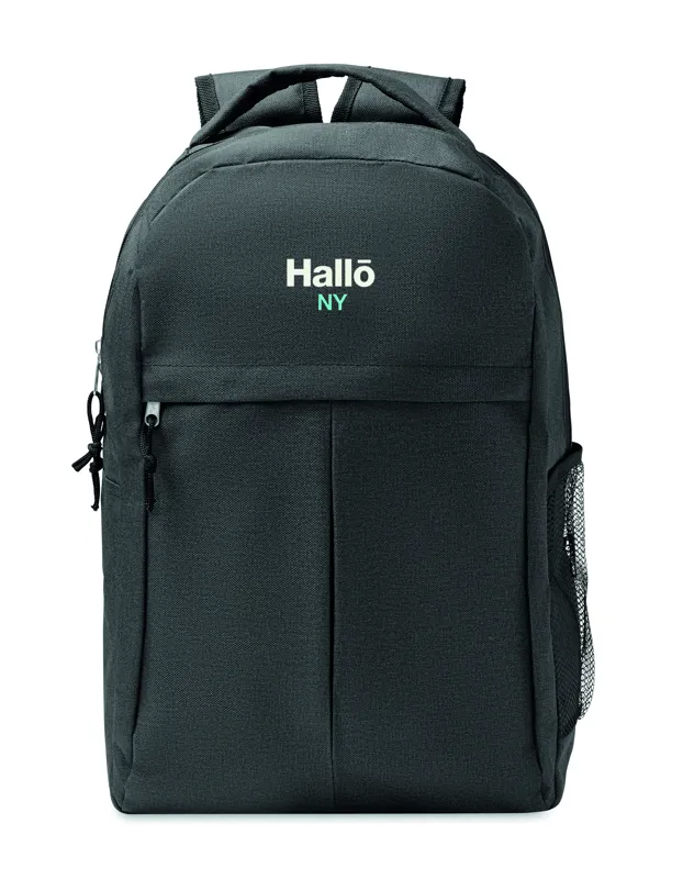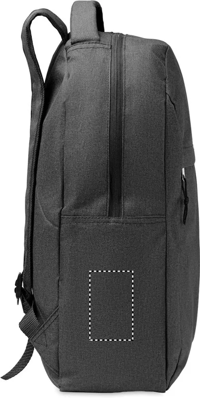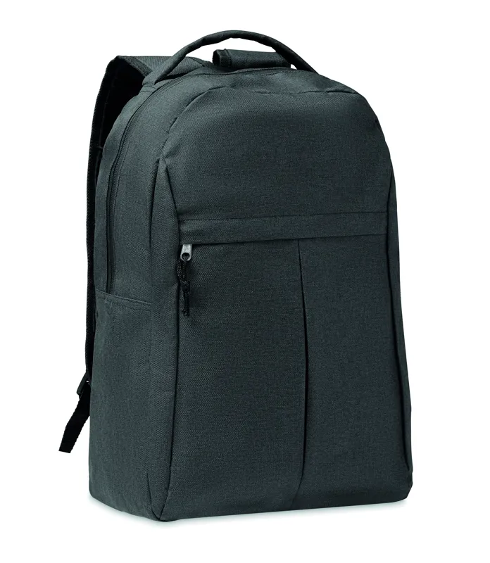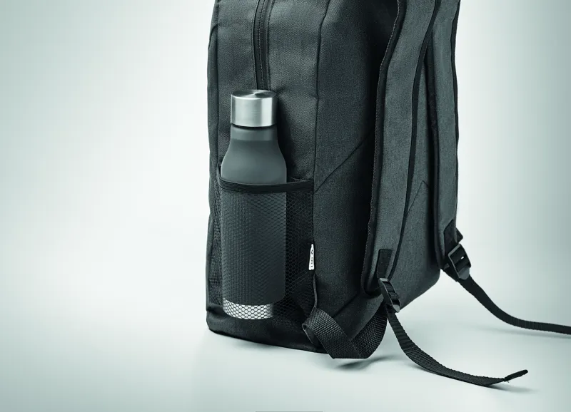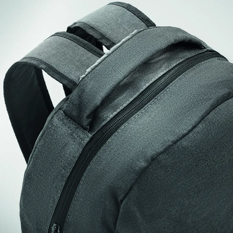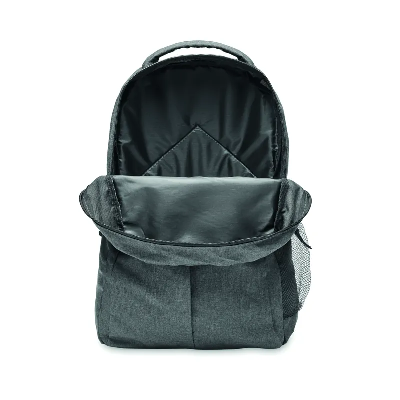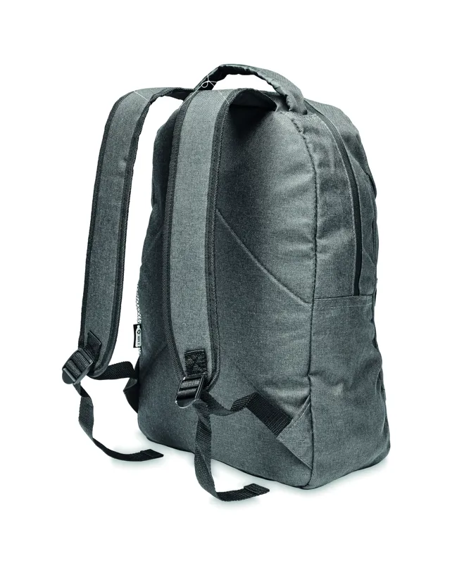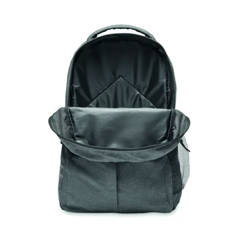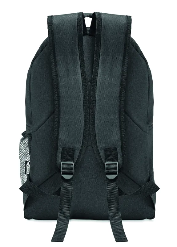 Hátizsák melírozott 600D RPET poliészterből, cipzáras külső zsebbel, az oldalán hálós zsebbel.
