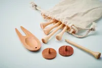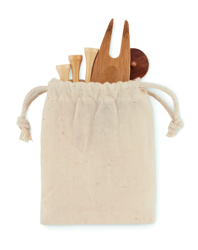 Golf kiegészítők bambuszból, beleértve 6 golf labdatartót (tee-t), 1 db golf pitch-villát és 2 fa markert, mindezt egy organikus pamut húzózsinóros táskában. A bambusz természetes anyag, színében, mintázatában és méretében esetenként eltérő lehet.