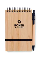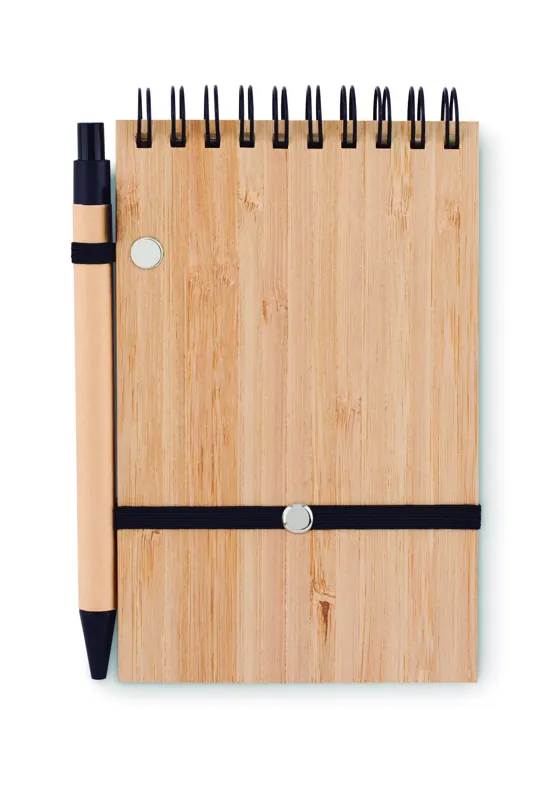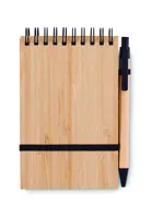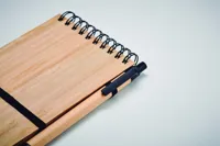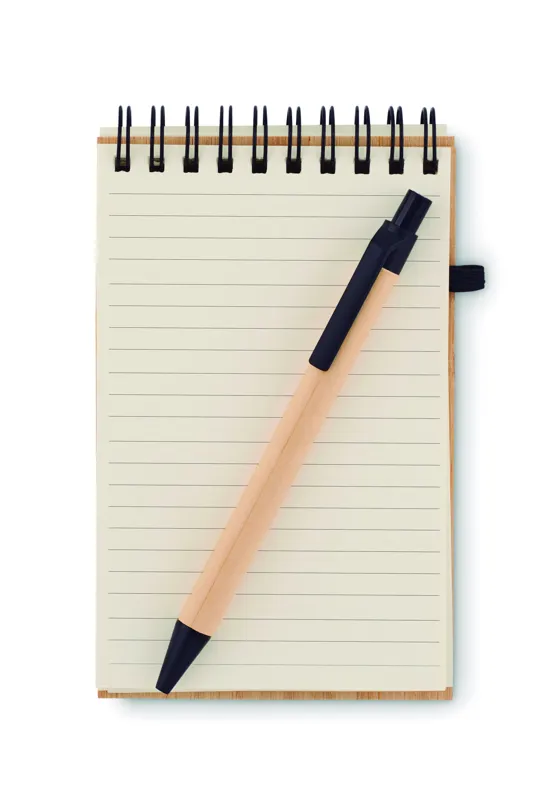 A6-os bambuszborítású jegyzettömb 70 vonalas, újrahasznosított papírlappal. Tartalmaz egy hozzá illő újrahasznosított karton tolltestű golyóstollat, melynek szerelvényei PLA műanyagból készültek. Írja le összes fontos jegyzetét a munkahelyi megbeszélések során ennek a praktikus irodai tárgynak a segítségével. A bambuszborító kellemes, természetes megjelenést kölcsönöz neki. A tolltest és a jegyzetlapok is újrahasznosított papírból készültek, így ez egy fenntartható választás. A toll kéken író betéttel rendelkezik. A bambusz természetes anyag, termékenként szín- és méretbeli eltérések jelentkezhetnek, ami befolyásolhatja a dekoráció végső eredményét. FSC®-certified | FSC MIX, P7.7, FSC-C213206