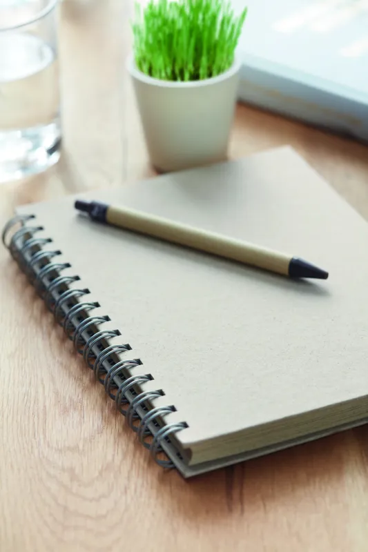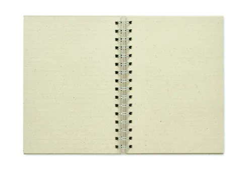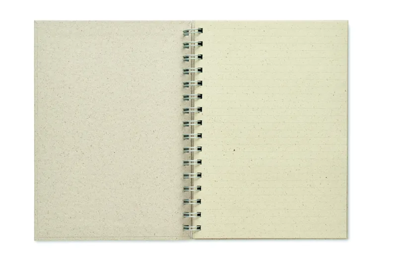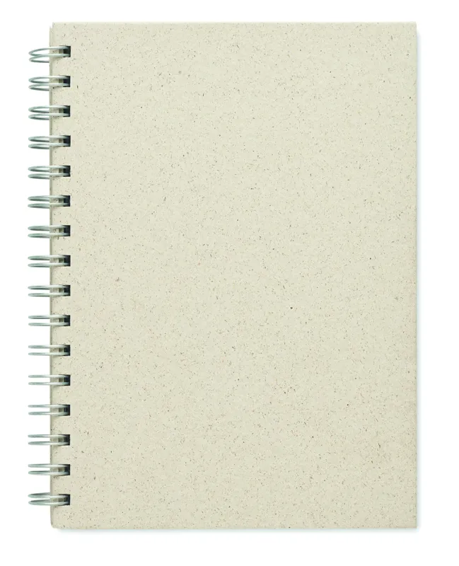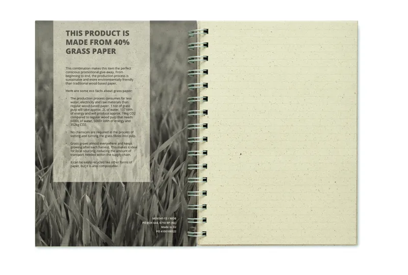A5-ös spirálos jegyzetfüzet 80 vonalas fűpapír lappal és karton borítóval. Kényelmes és praktikus az irodai megbeszélések vagy iskolai jegyzetek leírásához. A fűpapír tökéletes tudatos promóciós reklámajándék. Az előállítási folyamat az elejétől a végéig fenntartható és környezetbarátabb, mint a hagyományos faalapú papíré. EU-ban gyártva.