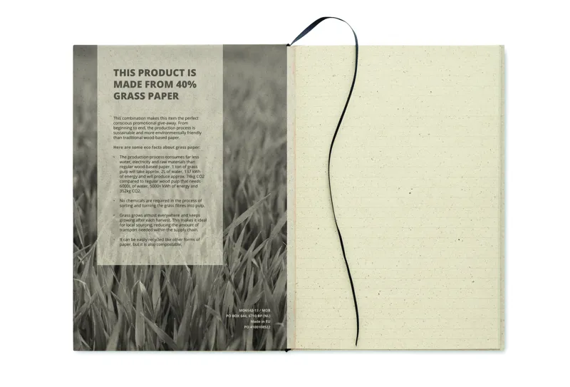 A5-ös jegyzetfüzet 80 vonalas fűpapír lappal és karton borítóval. Kényelmes és praktikus az irodai megbeszélések vagy iskolai jegyzetek leírásához. A fűpapír tökéletes tudatos promóciós reklámajándék. Az előállítási folyamat az elejétől a végéig fenntartható és környezetbarátabb, mint a hagyományos faalapú papíré. EU-ban gyártva.