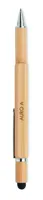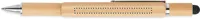 Csavarmechanikás, érintőhegyes golyóstoll bambuszból, vízmértékkel, 7 cm-es vonalzóval, valamint csillag- és lapos fejű csavarhúzó bitekkel. Kéken író betéttel. A bambusz természetes anyag, színében, mintázatában és méretében esetenként eltérő lehet.