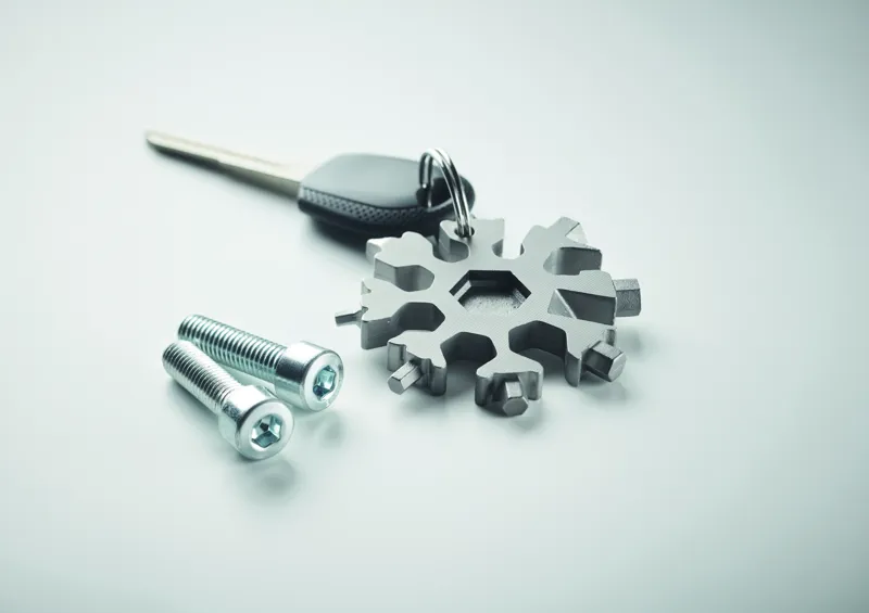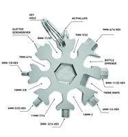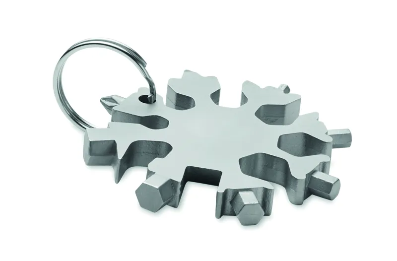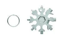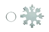 Hópehely alakú, többfunkciós 17 az 1-ben szerszám rozsdamentes acélból. Opcionális kulcskarikával szállítjuk.