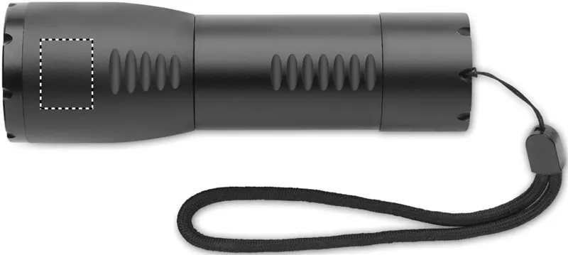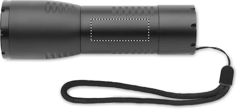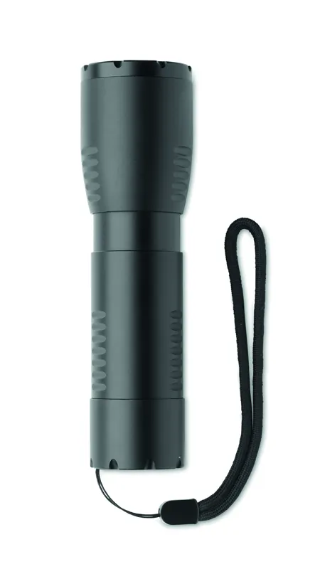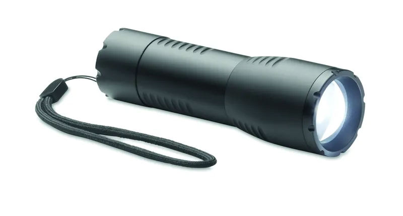 Alumíniumból készült, kis LED-es zseblámpa állítható fókusszal, levehető pánttal. Teljesítmény: 200 lumen. 3 db AA elemmel működik, elem nélkül szállítjuk.