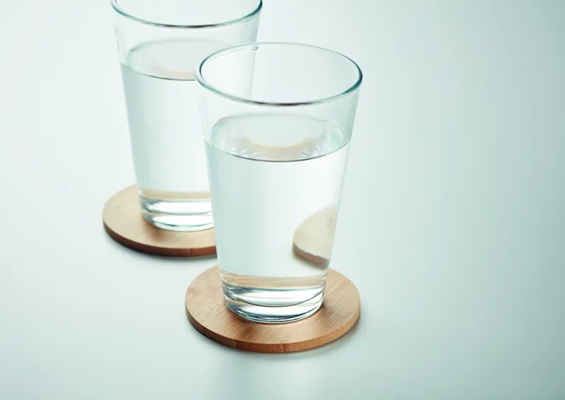 6 darab kerek bambusz poháralátétből álló készlet, pamut húzózsinórral ellátott táskában. A bambusz természetes anyag, színében, mintázatában és méretében esetenként eltérő lehet.