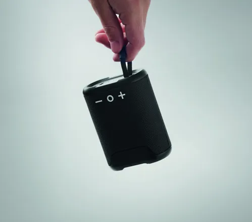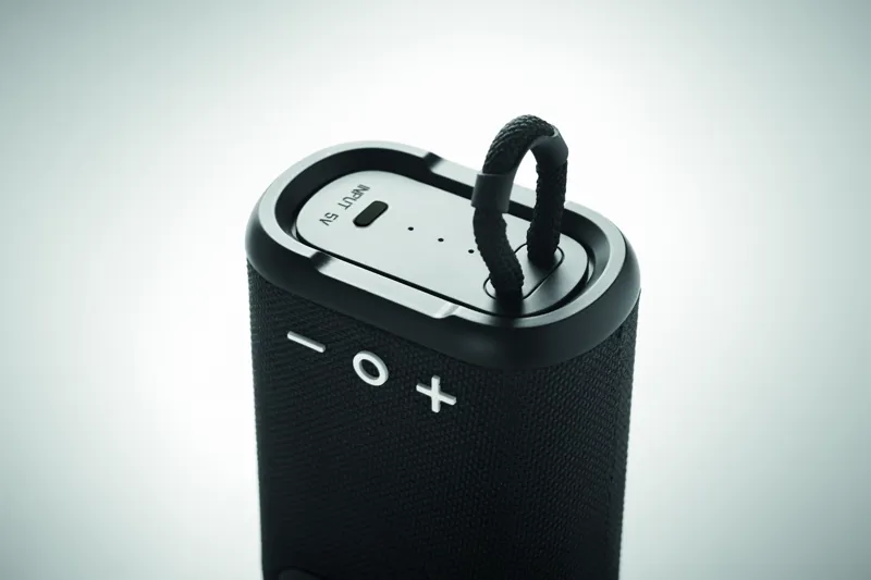 5.0 vezeték nélküli hangszóró ABS műanyag házzal, 30% kender és 70% poliészter hangfalselyemmel, fogantyúval. IPX7 fröccsenésbiztos. 1 db újratölthető 1800 mAh lítium-ion elemmel. Teljesítmény: 5W, 4 Ohm. Üzemidő kb. 8 óra.
