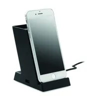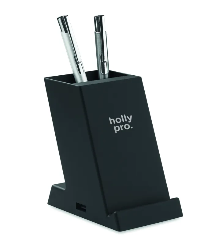 15W-os duplatekercses vezeték nélküli töltő tolltartóval ABS műanyagból. Teljesítmény: DC 9V/1.67A (15W) a gyors töltéshez. 1 USB-A portos áramkimenet.