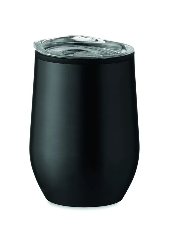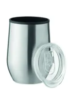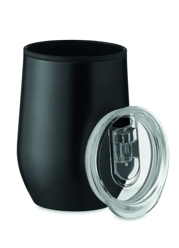 Duplafalú rozsdamentes acél pohár PP belső résszel és átlátszó PS fedéllel. Űrtartalom: 350 ml.