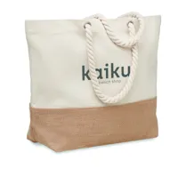 Strandtáska vagy bevásárlótáska vászonból, kötél füllel és juta részlettel. 280 g vastag anyag.