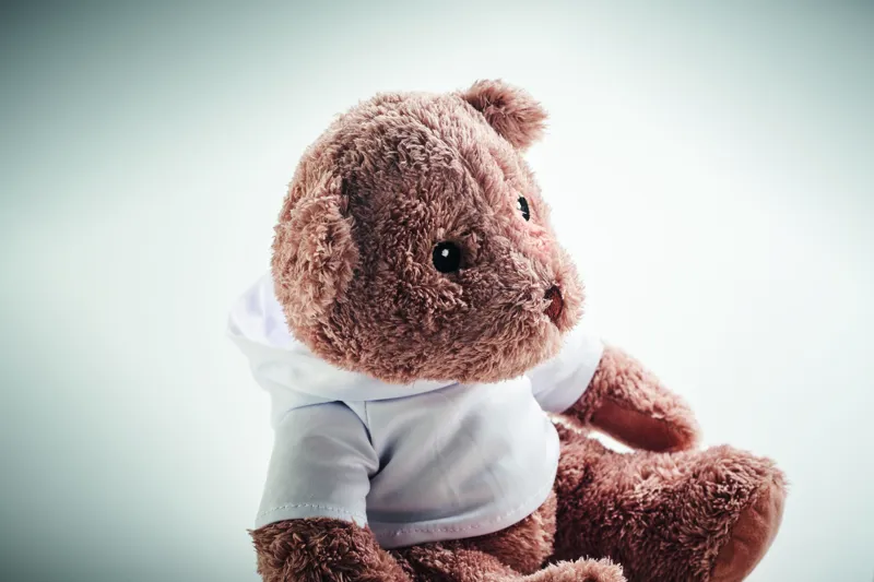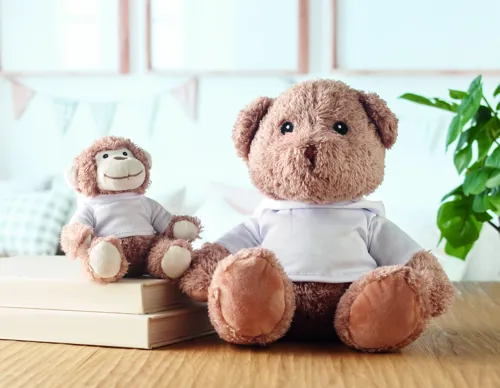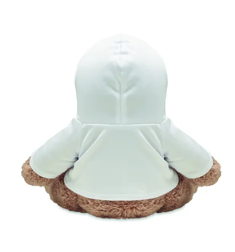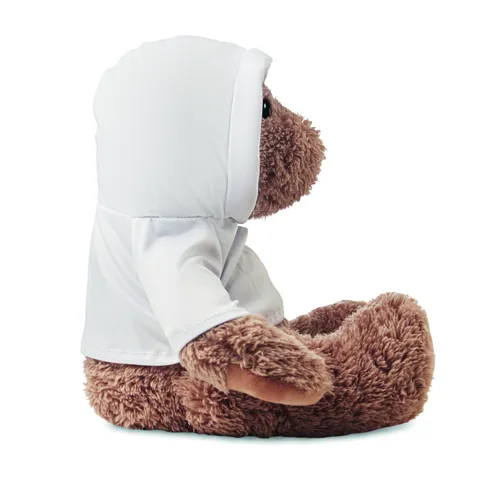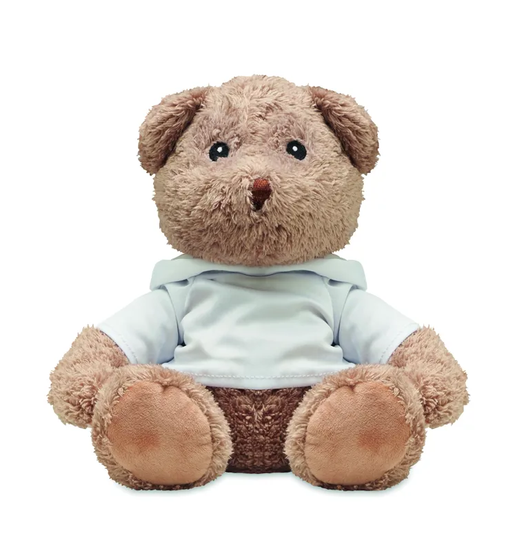 Kapucnis pulóvert viselő nagy plüss mackó. A pulóver ideális szublimációs nyomtatáshoz.