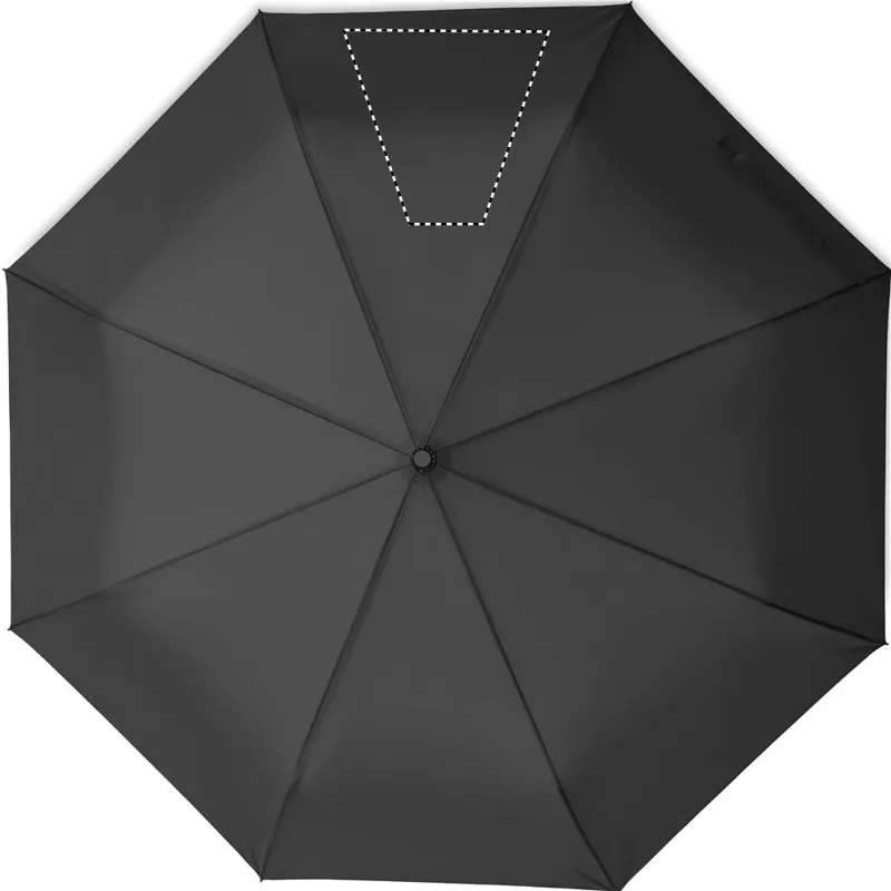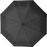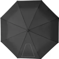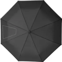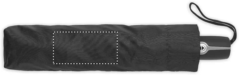 27 colos, 3 szakaszos összecsukható, automatikusan nyíló és záródó, szélálló esernyő. 190T nyersselyem anyagból készült, fekete bevonatos acél szárral. Üvegszálas bordák, fekete PP fogantyú nyomógombbal. Hozzáillő tokban.