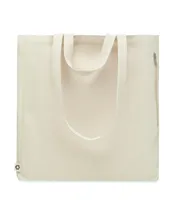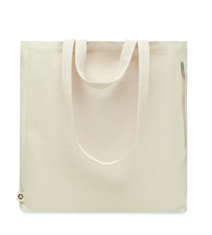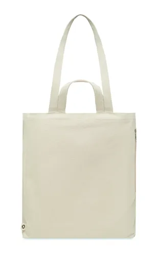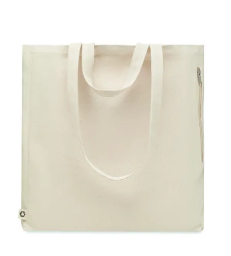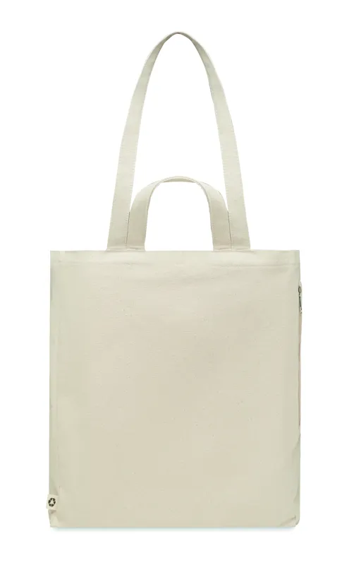 Újrahasznosított poliészter-pamut bevásárló- vagy strandtáska (70% újrahasznosított pamut, 30% újrahasznosított poliészter) rövid és hosszú fülekkel. Oldalsó cipzáras zsebbel. 380 g/m².