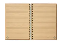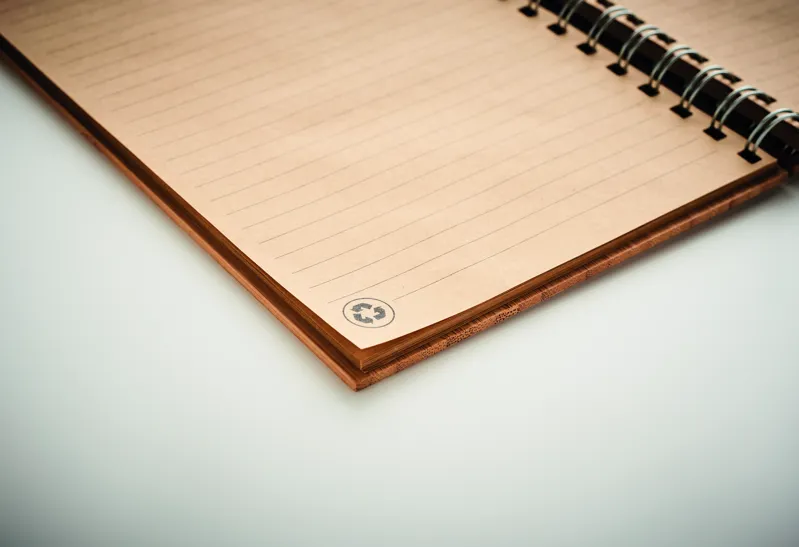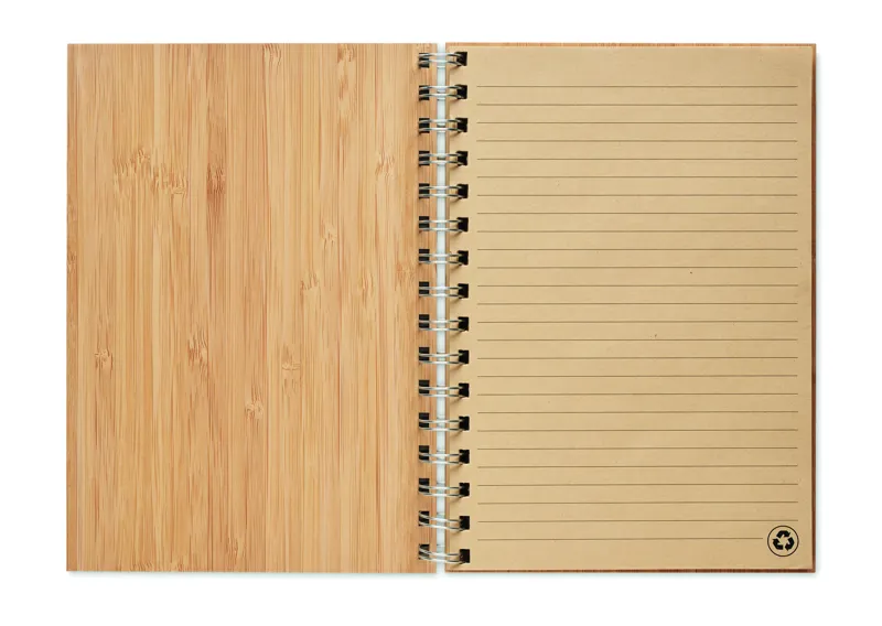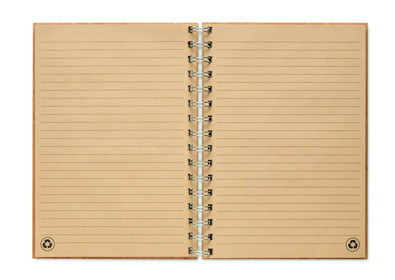 Bambuszfedeles jegyzetfüzet. Ikerspirálozott, 140 vonalas kraftpapír oldal (70 lap). A bambusz természetes anyag, színében, mintázatában és méretében esetenként eltérő lehet.