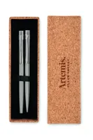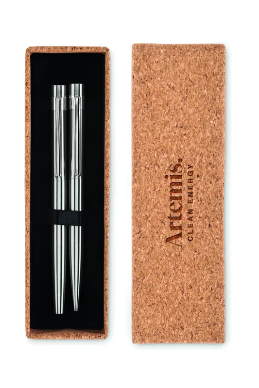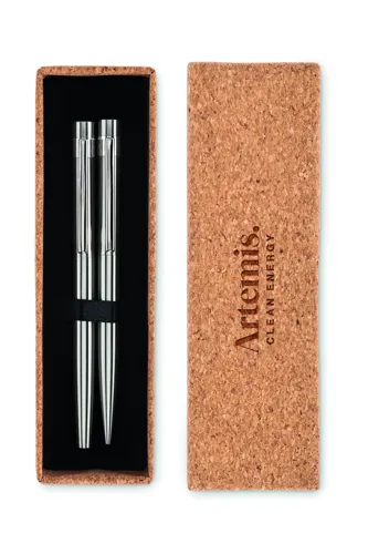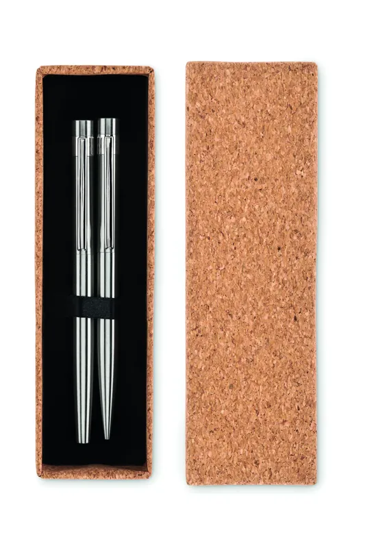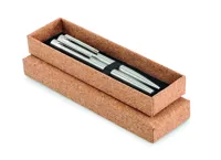 Újrahasznosított rozsdamentes acélból készült tollkészlet golyóstollal és roller tollal. Parafa ajándékdobozban. Kéken és feketén író betéttel. A parafa 100%-ban természetes anyag. Szerkezeti jellege és felületi porozitása miatt az egyes tárgyak végső emblémázási eredménye eltéréseket mutathat.