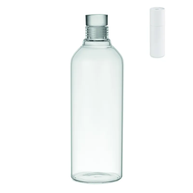 Nagyméretű boroszilikát üvegpalack szivárgásmentes üvegdugóval. Hengeres ajándékdobozban. Űrtartalom: 1 l.