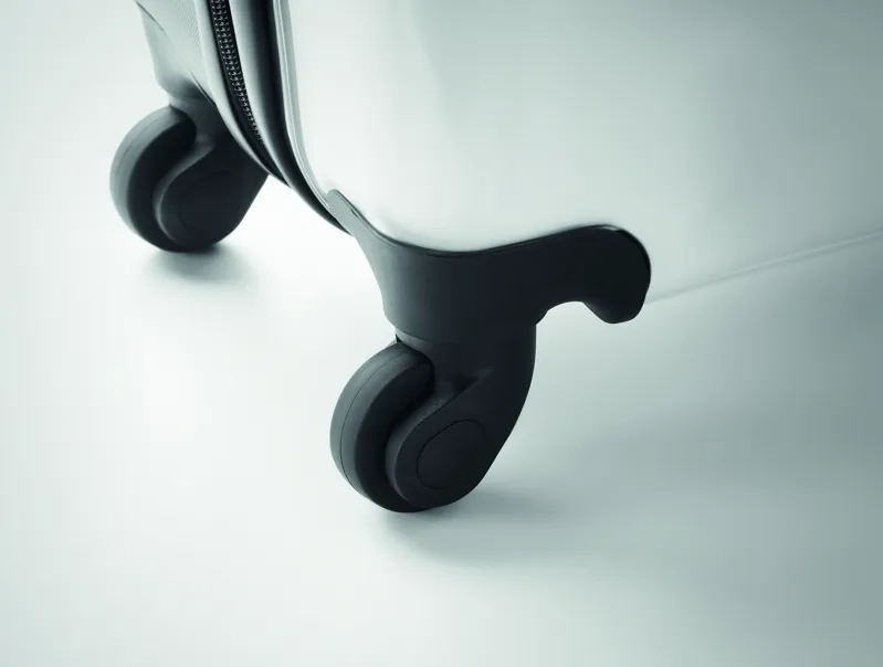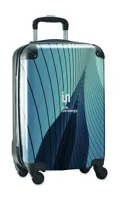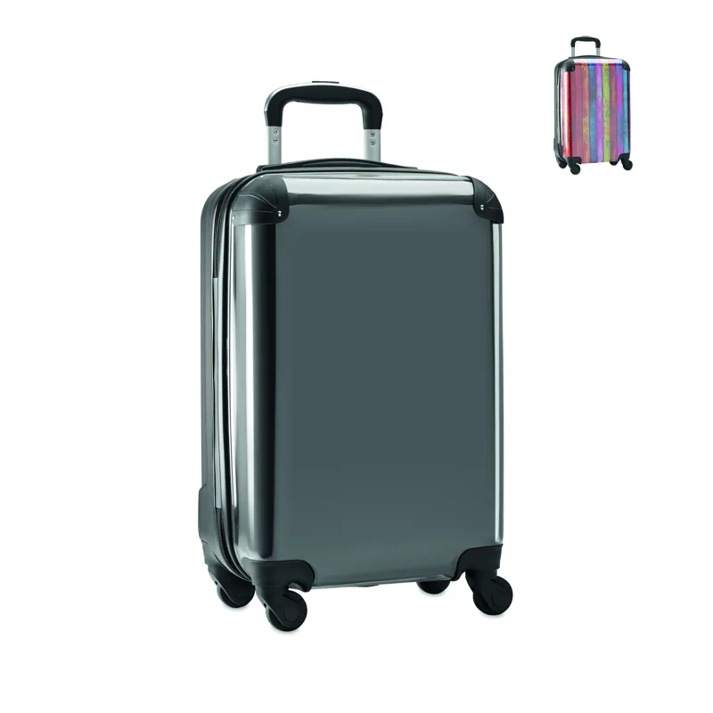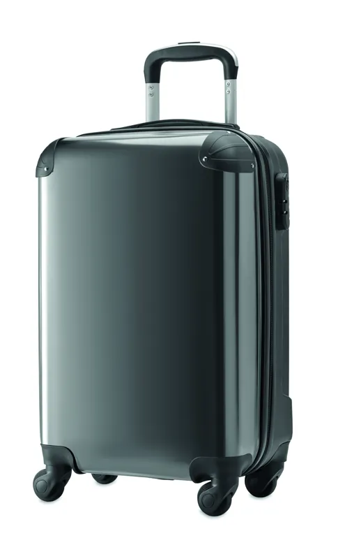 Gurulós bőrönd polikarbonátból és ABS-ből, egészoldalas nyomtatható betétlappal. Az embléma nélküli rendeléseket fekete lappal szállítjuk. Felső cipzáras rekesszel és alsó rögzítőszalagos rekesszel, kombinációs zárral.